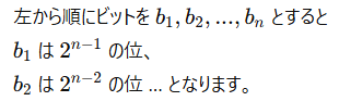 ここでは2進数を左から順に1文字ずつ読んで10進数に変換する方法を考えます。桁の重みで考えると