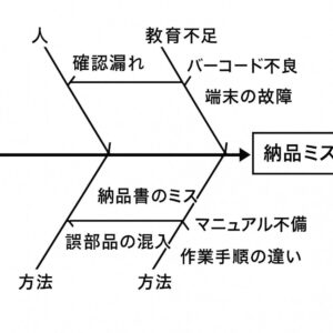 「納品ミスが多い」 → 「人(教育不足・確認漏れ)」「機械(端末故障)」「方法(手順不備)」など原因を体系的に並べる。