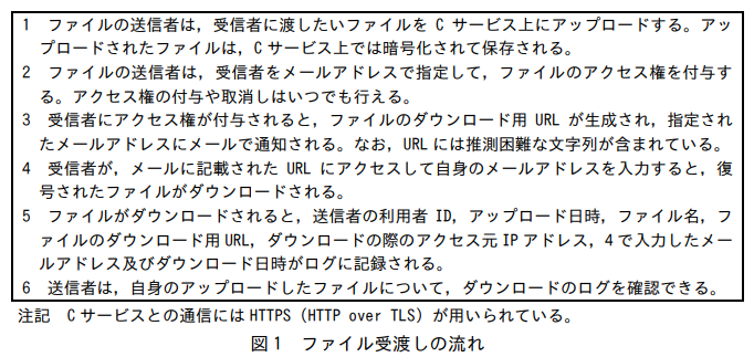 問14 A 社は、従業員 300 名の部品メーカーである。A 社ではこれまで、業務に必要なファイルを他社との間で受け渡す場合には電子メール(以下、メールという)を利用してきた。最近になって、取引先の B 社から、ファイルの受渡しについては、C サービスというクラウドストレージサービスを利用して欲しいとの要請を受けた。図1 は、C サービスを利用した場合のファイル受渡しの流れである。